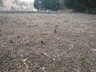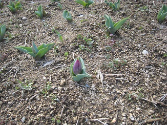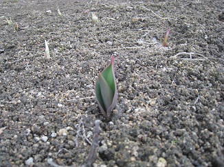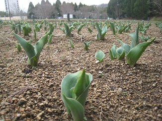 令和8年2月13日のチューリップ園 今年も芽が出始めました! これからの成長が楽しみです☆